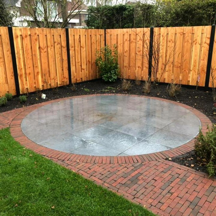 Deze achtertuin is voorzien van antraciet betontegels gecombineerd met oude dikformaten.