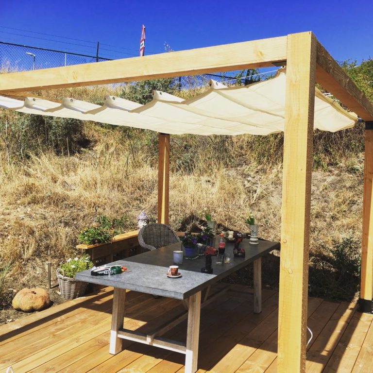 Douglashouten Pergola Douglashouten pergola met harmonica schaduwdoek, gezellige plek geworden. Bekijk project