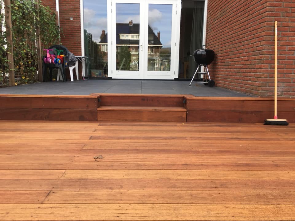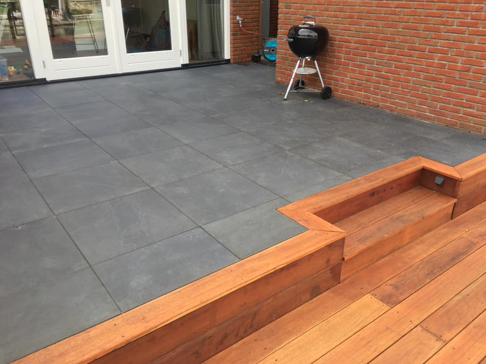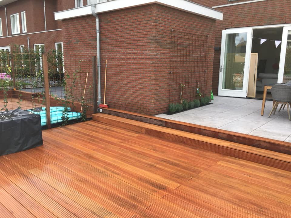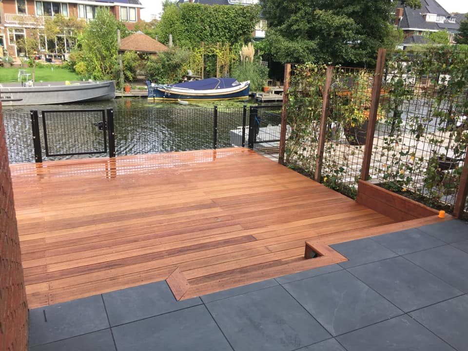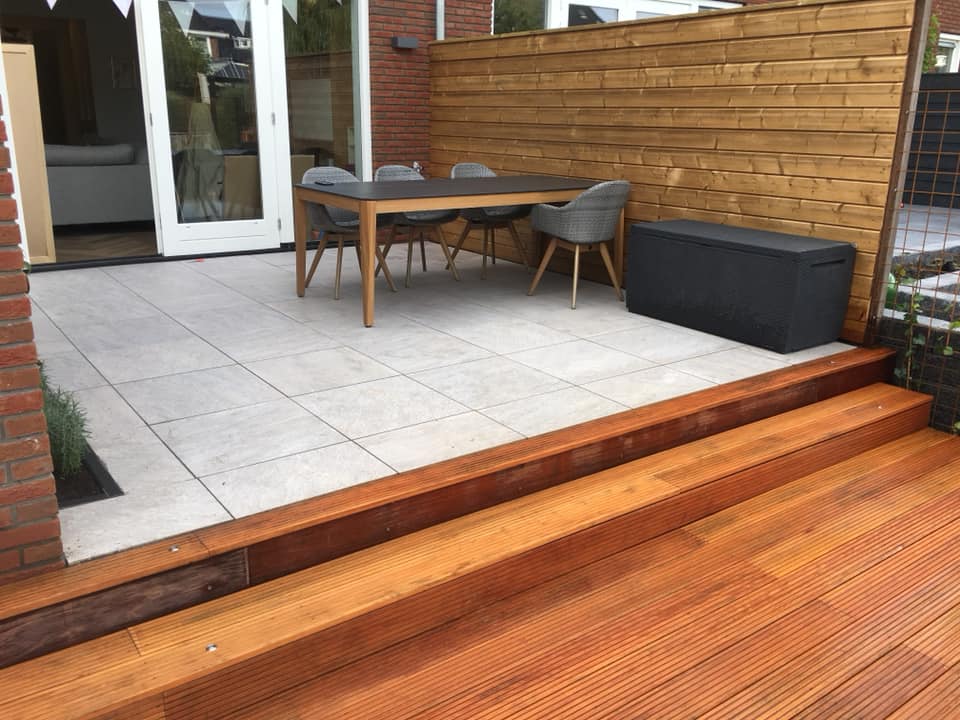 De tuinen voorzien van een hardhouten vlonder gecombineerd met keramische tegels.