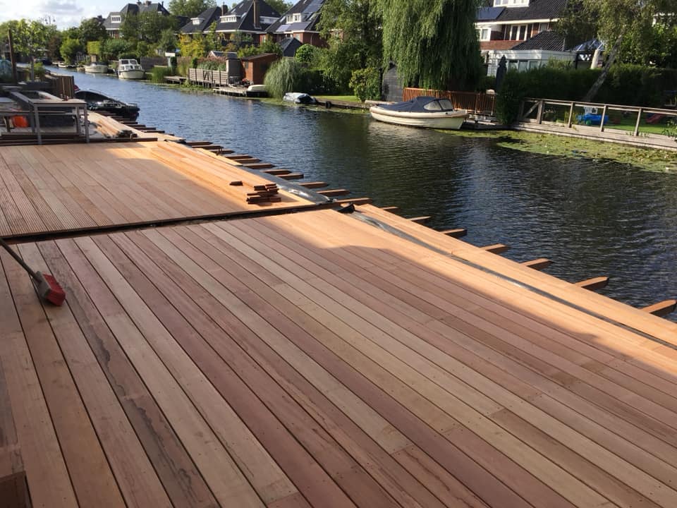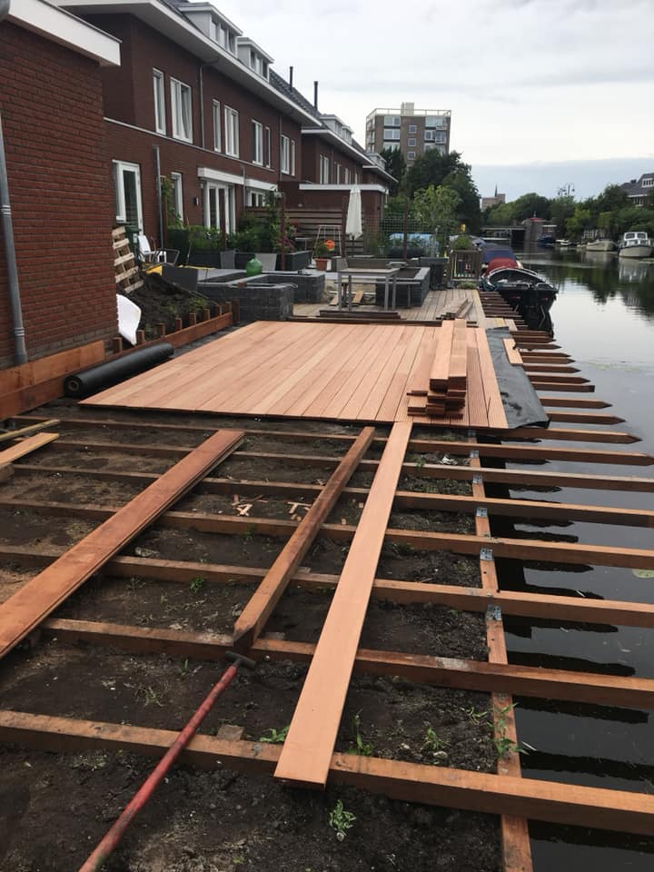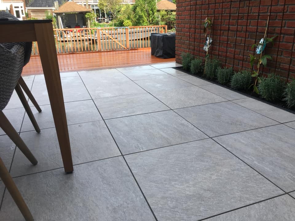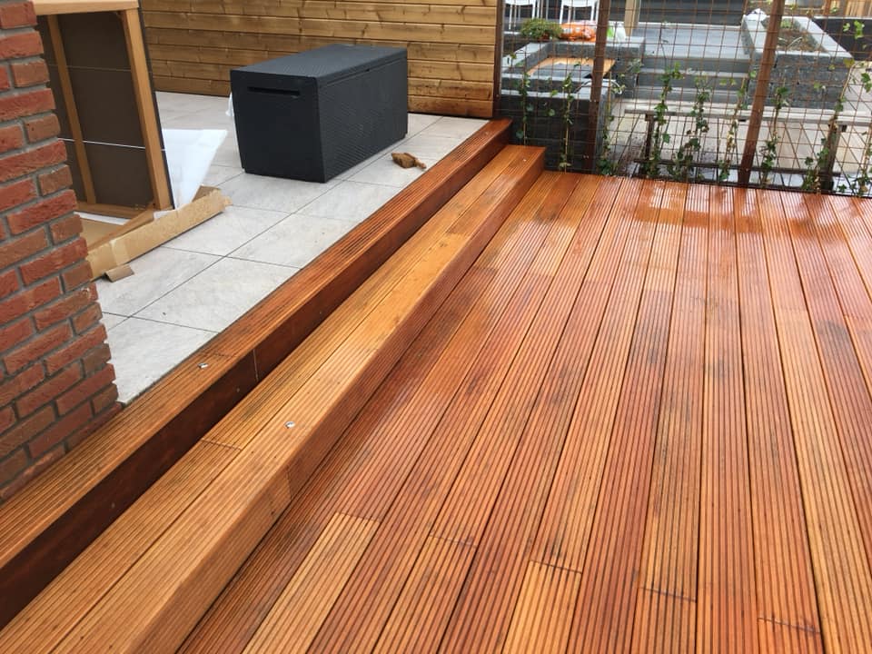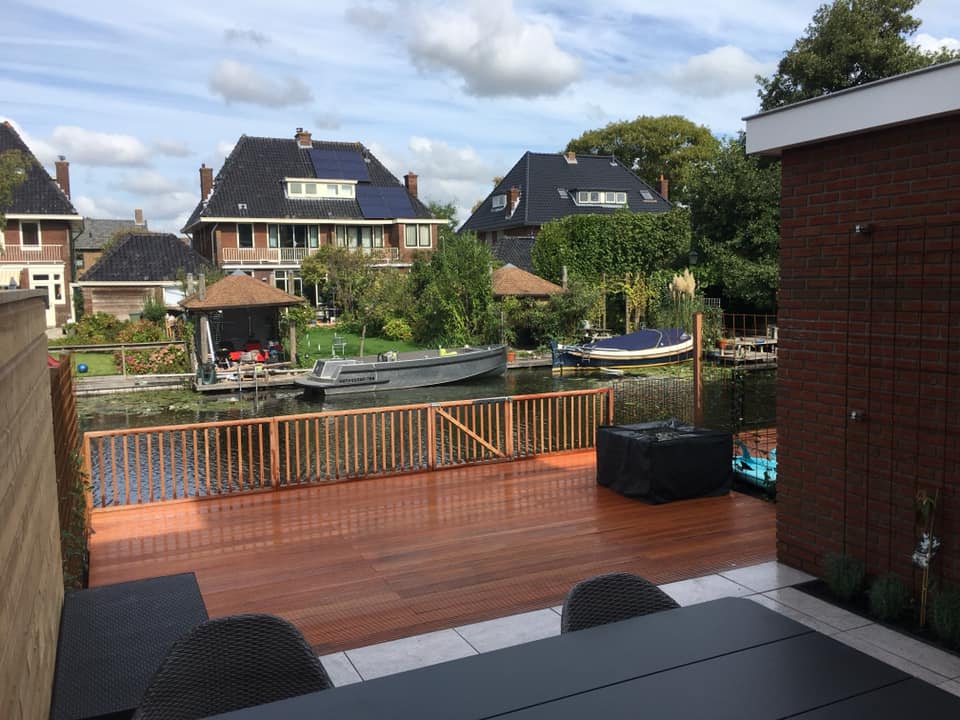 De tuinen voorzien van een hardhouten vlonder gecombineerd met keramische tegels.